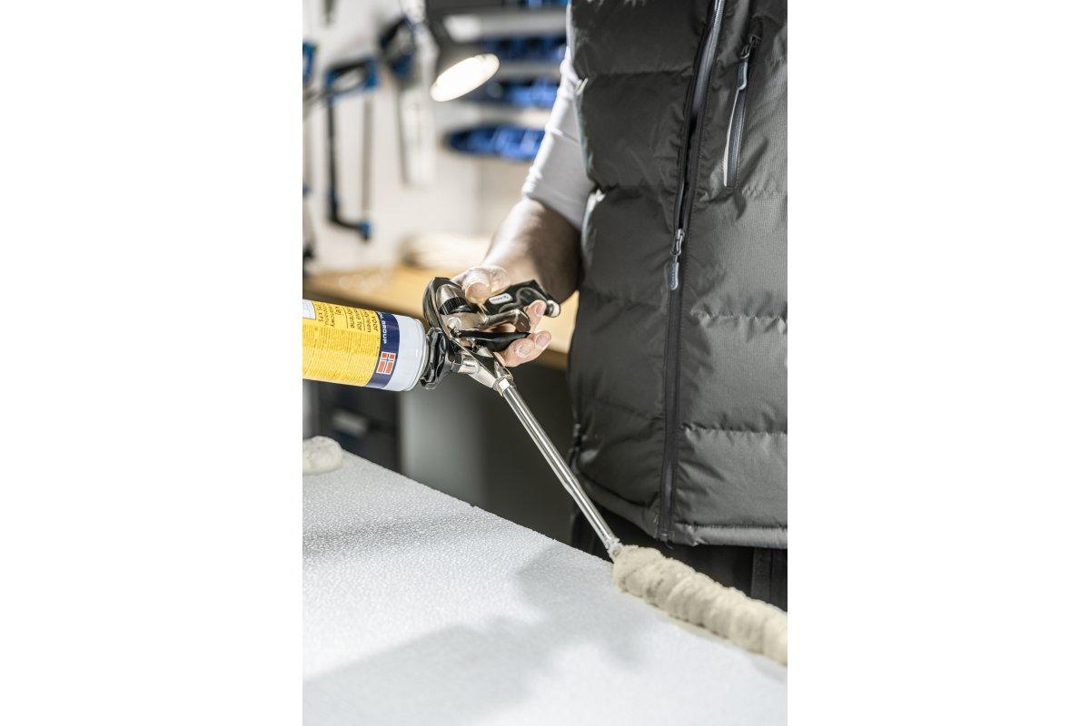 Pištola za ekspandiranje PU pene. Priporočljivo za izolacijo, tesnjenje in zapolnjevanje rež.